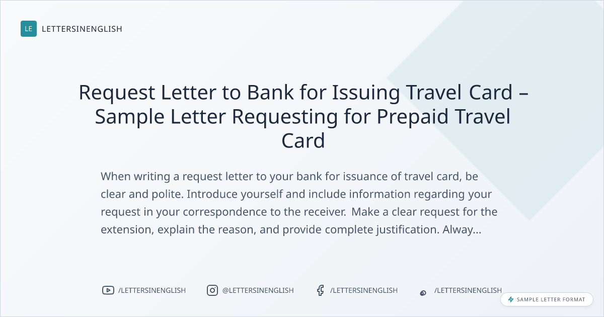 When writing a request letter to your bank for issuance of travel card, be clear and polite. Introduce yourself and include information regarding your request in your correspondence to the receiver. Make a clear request for the extension, explain the reason, and provide complete justification. Always thank the receiver for considering your request. Avoid unclear language and ensure all necessary information is included.
