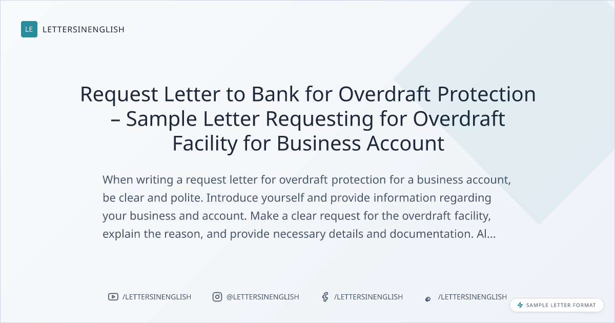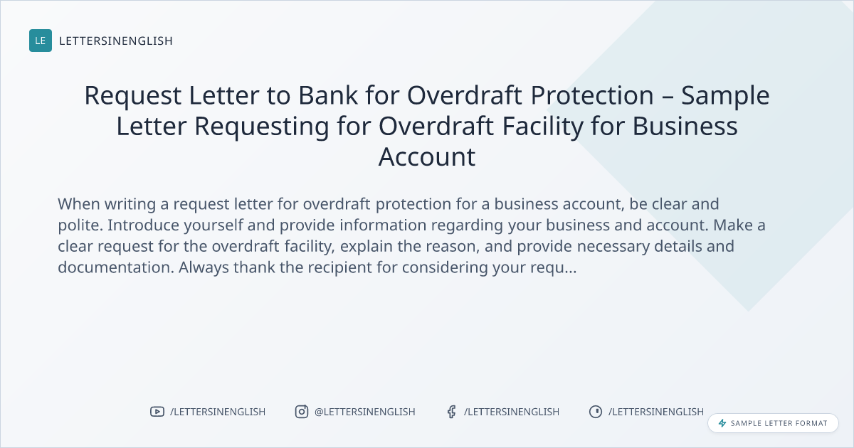 When writing a request letter for overdraft protection for a business account, be clear and polite. Introduce yourself and provide information regarding your business and account. Make a clear request for the overdraft facility, explain the reason, and provide necessary details and documentation. Always thank the recipient for considering your request. Avoid unclear language and ensure all essential information is included.