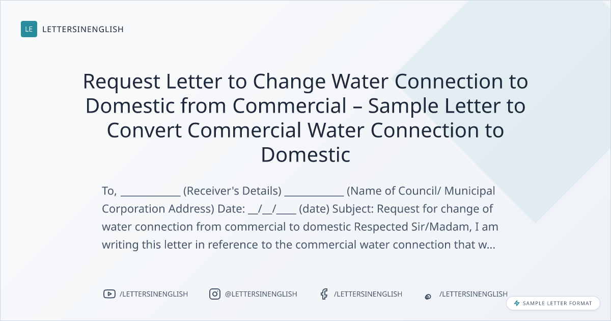 Request Letter to Change Water Connection to Domestic from Commercial – Sample Letter to Convert Commercial Water Connection to Domestic