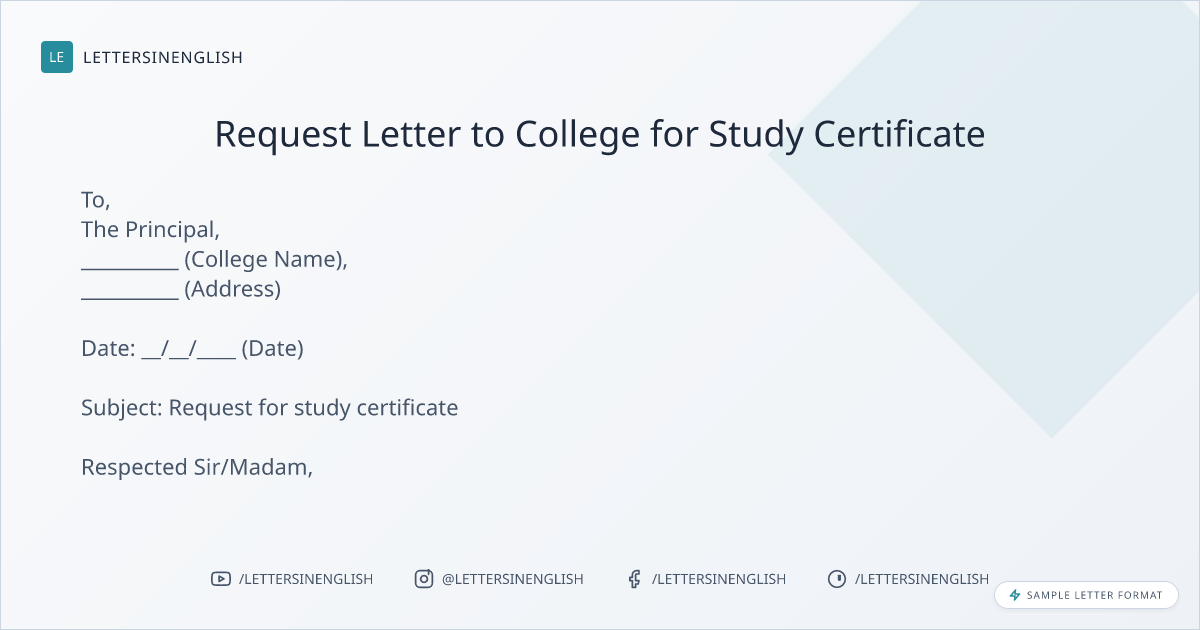 My name is ______ (Name) and I am writing this letter to request you to kindly issue a study certificate in my name. I was a student of __________ (Department) department and I completed my education in ____-____ year.