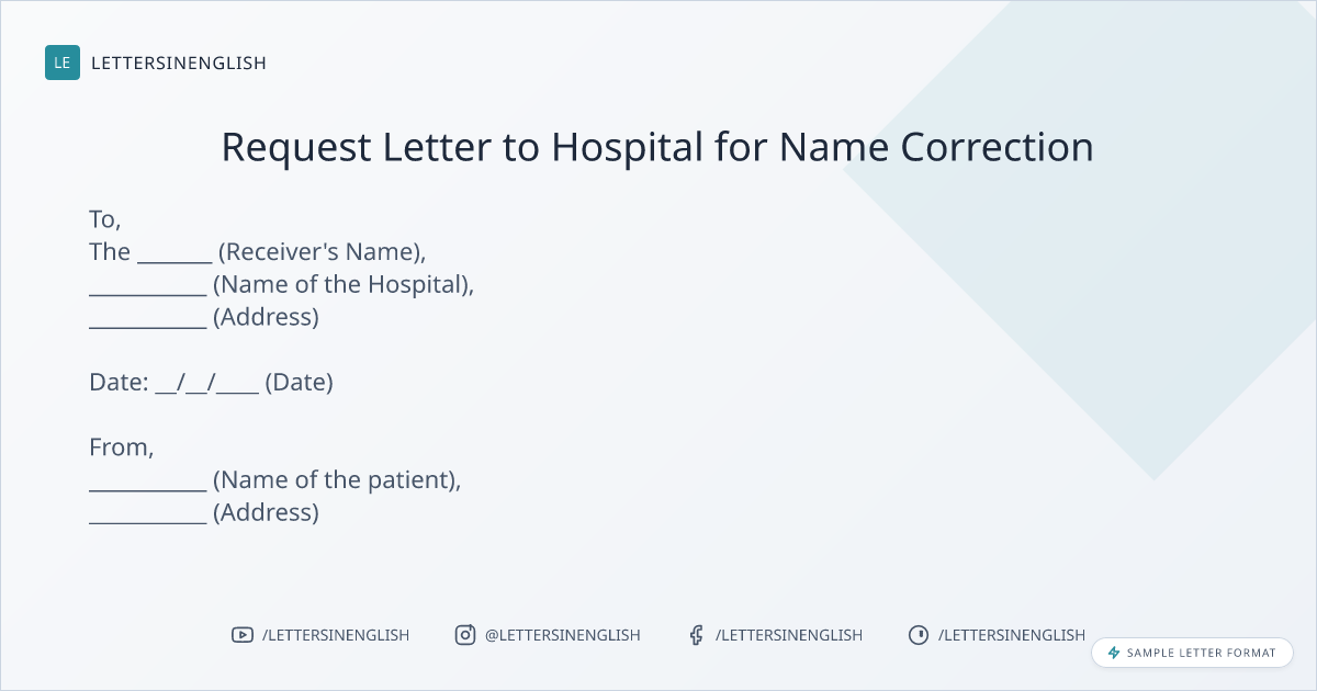I would most humbly inform you that my patient ID is _______ (Patient ID) and my name as on the invoice is __________ (Name) which is incorrect. I request you to kindly correct the name to _________ (Correct Name). I request you to issue a copy of the invoice with the correct spelling. I am in need of the same for _________ (maintaining personal records/ Medical claim/ any other).