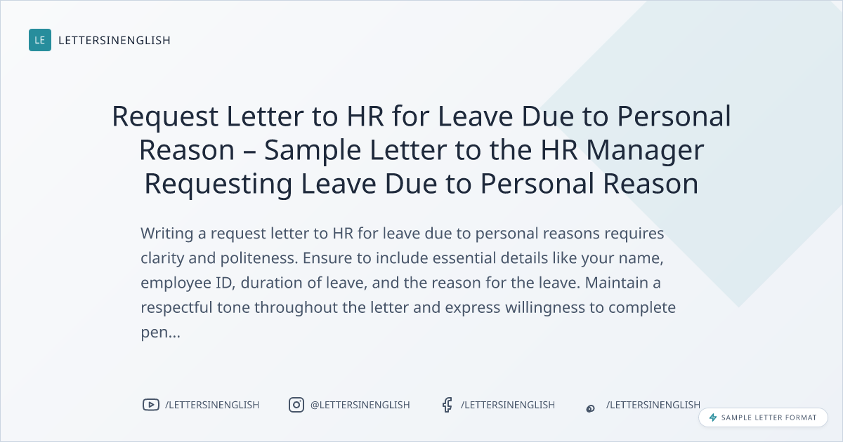 Request Letter to HR for Leave Due to Personal Reason – Sample Letter to the HR Manager Requesting Leave Due to Personal Reason