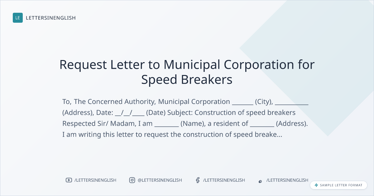 Respectfully, I am writing this letter in order to request you for constructing the speed breakers at _________ (Location) due to the reason that _____ (school/ college/ hospitals) are located in the mentioned locality and people usually over speed vehicle while passing by and which is becoming a matter of concern. It is requested to kindly construct the speed breakers in order to prevent any mishappenings.
