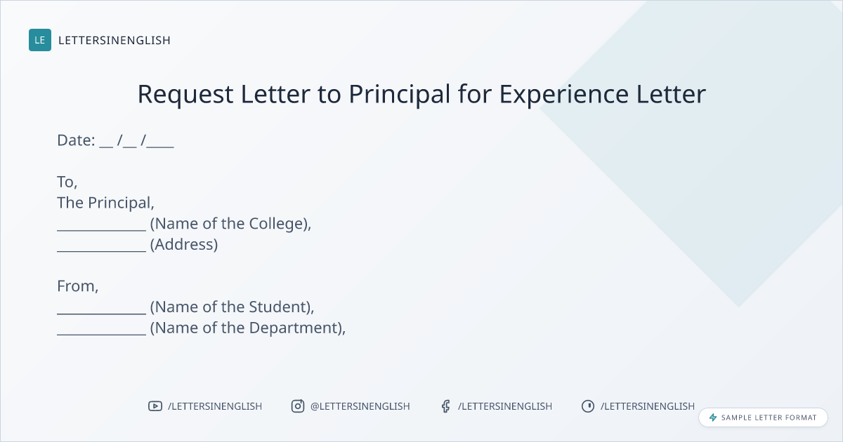 I am writing this letter to request an experience letter for the _________ (details of experience work) which was _____________ (details) at ___________ (Name of the department). I have fulfilled the following duties ___________ (Mention all the roles performed). This certificate would enhance my resume.