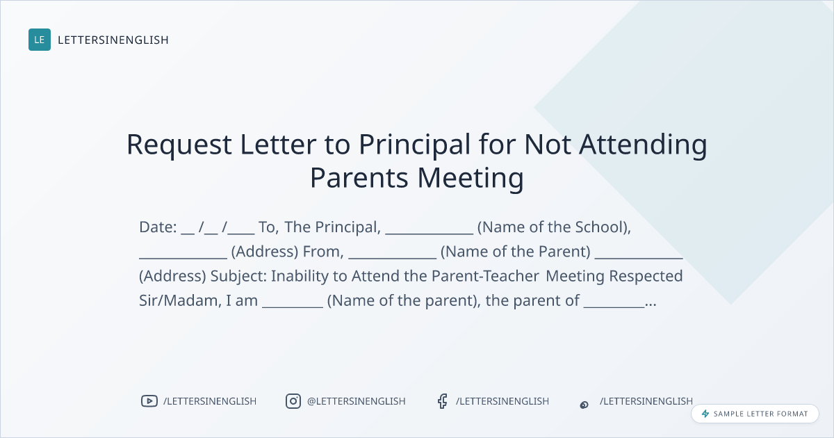 I am writing this letter to inform you my inability in attending the parent teacher meeting held on __________ (date) for the reason ____________ (Mention the reason/Office issues/others).