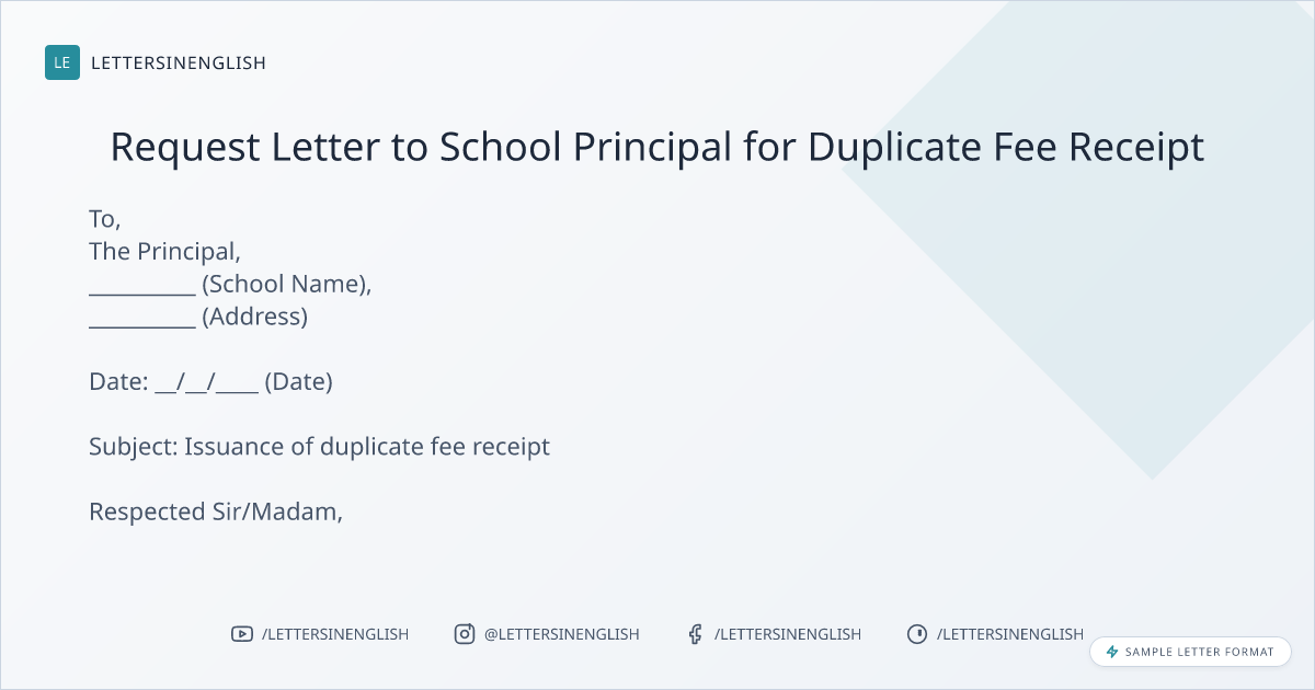 I am most respectfully writing this letter to request you for re-issuance of fee receipt for the _________ (Financial Year/ Quarter) ________ (Mention). I beg to inform that the original receipt got _________ (lost/ misplaced/ damaged/ any other) during ________ (lost reason). I am in need of the above-mentioned receipt for ________ (Mention purpose).