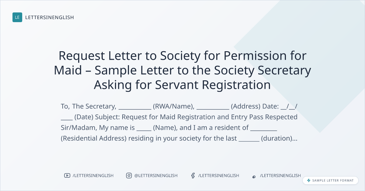 Request Letter to Society for Permission for Maid – Sample Letter to the Society Secretary Asking for Servant Registration