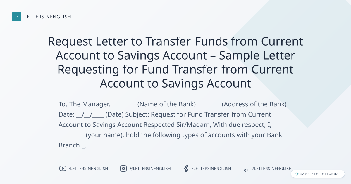 Request Letter to Transfer Funds from Current Account to Savings Account – Sample Letter Requesting for Fund Transfer from Current Account to Savings Account