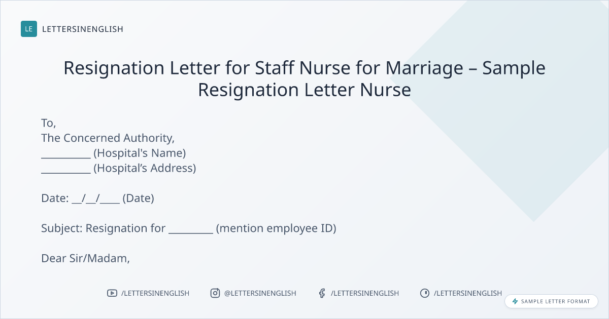 Sample Resignation Letter for Staff Nurse for Marriage