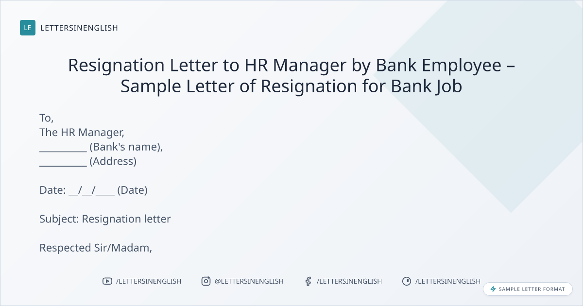 Resignation Letter to HR Manager by Bank Employee – Sample Letter of Resignation for Bank Job