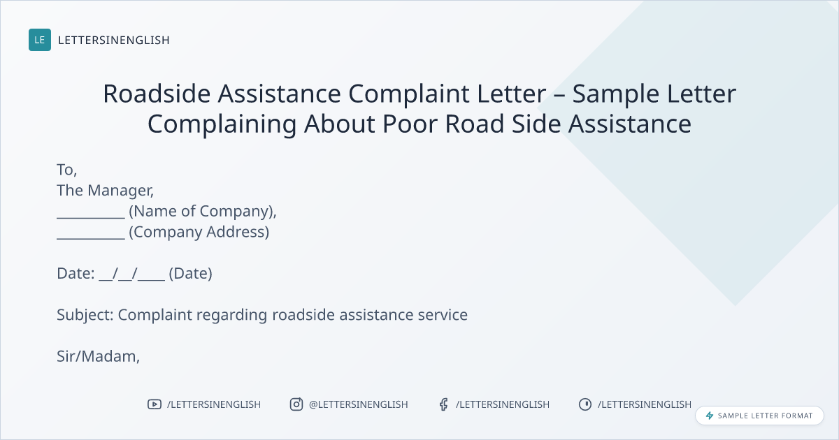 Roadside Assistance Complaint Letter – Sample Letter Complaining About Poor Road Side Assistance