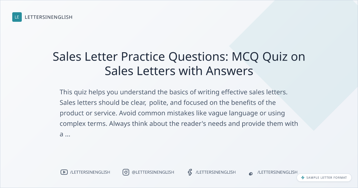 This quiz helps you understand the basics of writing effective sales letters. Sales letters should be clear, polite, and focused on the benefits of the product or service. Avoid common mistakes like vague language or using complex terms. Always think about the reader’s needs and provide them with a clear call to action. A good sales letter has a strong opening, detailed body, and a polite conclusion. The key is to persuade the reader while keeping the message simple and to the point.