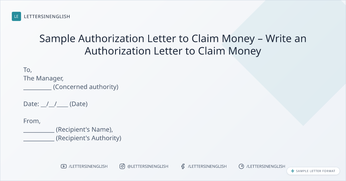 ___________ (Recipient’s Authority)Subject: Authority letter to claim money