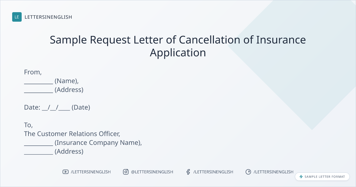 This letter is in reference to the application number ________ (application number) which was submitted from my side regarding the purchase of insurance with _______ (Mention Details – policy name/ premium/ benefits/ any other). I would like to inform you that due to _________ (mention reason for cancellation) I am not willing to proceed with the above-mentioned insurance service.