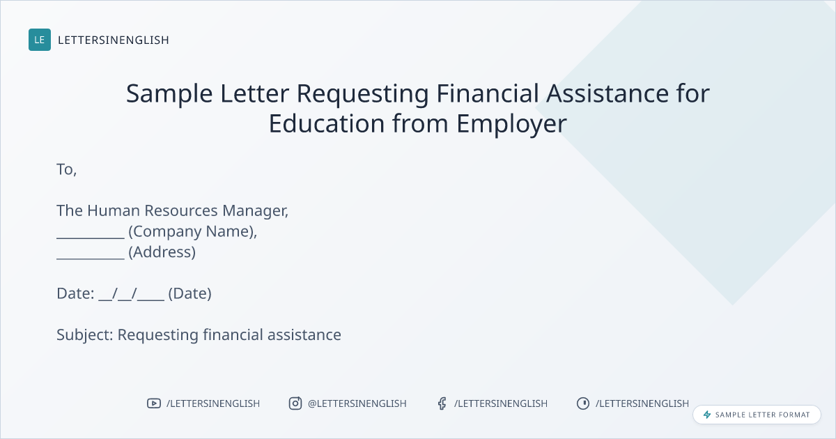 I am writing this letter to request you for financial assistance for education. As per your company’s _________ (Policy Name) and _________ (Benefit) I am entitled to avail benefit of financial assistance for education. My _________ (Son/ Daughter/ Self) is pursuing _________ (course name) from _________ (Institute Name) for which I would like to avail the financial assistance in order to support my educational expenses.