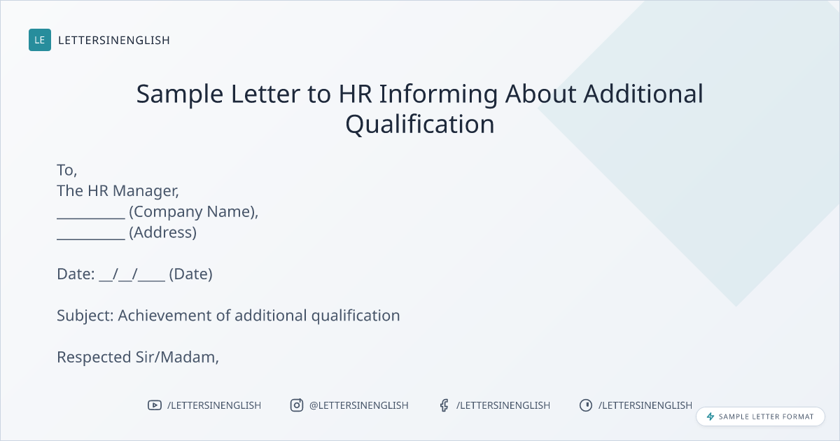 When writing a letter to inform HR about an additional qualification, ensure the letter is clear and polite. Mention your name, department, and designation, as well as details of the qualification such as the course name and institute. Request HR to update your records and express gratitude for their support. Avoid unclear language and include all necessary details.