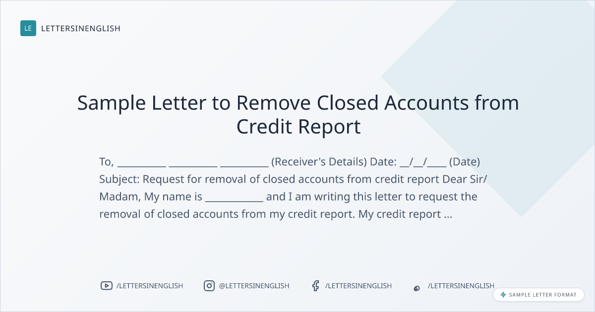 My name is ____________ (Name) and I am writing this letter to you in order to request for the removal of closed accounts from my credit report. My credit report details are ___________ (credit report details).