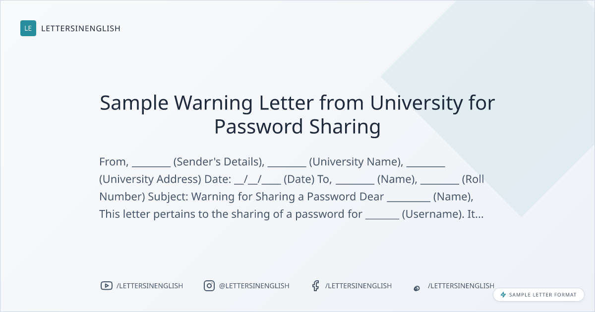 This letter is in reference to the password sharing for _______ (Username). It is being noticed that Mr./Mrs _______ (Name) has shared the password with an unauthorized user. As per the University’s norms, anyone sharing a password or any confidential data will be liable for legal action.