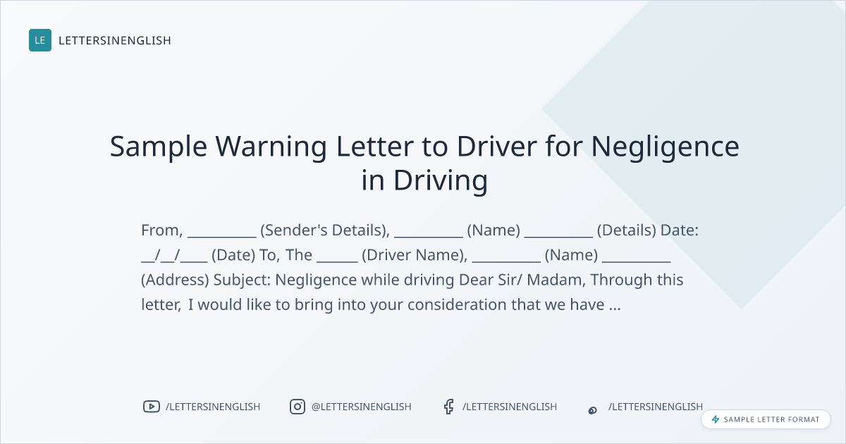 Through this letter, I would like to bring into your consideration that we have received a complaint about _______ (rash driving/ negligence/poor driving/any other) while driving in your name i.e. ______ (name) for vehicle number _______ (mention vehicle number).