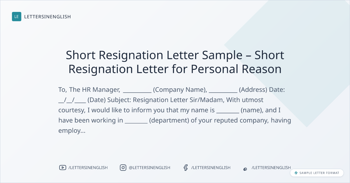 Short Resignation Letter Sample – Short Resignation Letter for Personal Reason