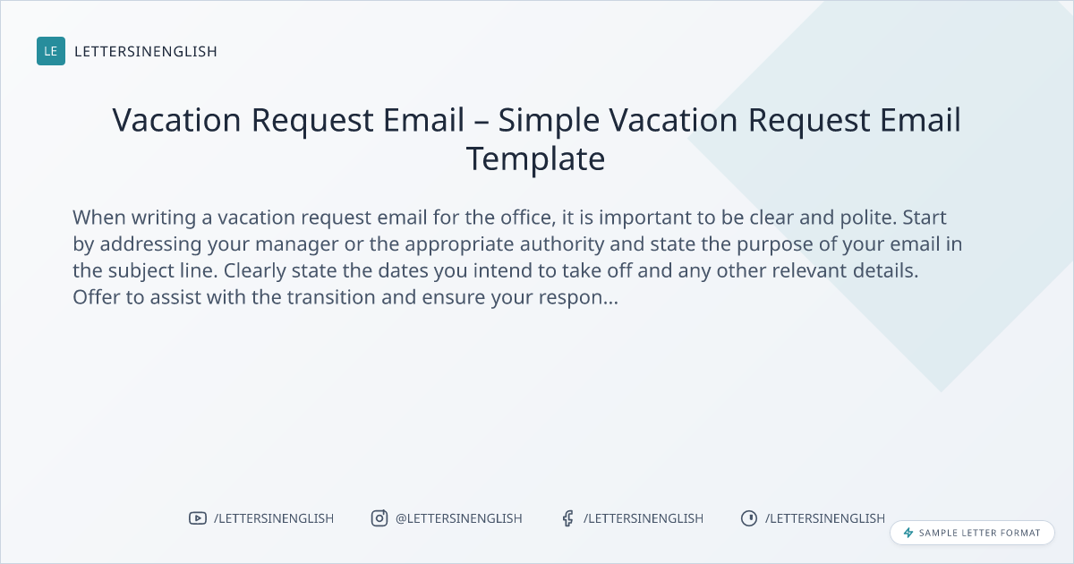 When writing a vacation request email for the office, it is important to be clear and polite. Start by addressing your manager or the appropriate authority and state the purpose of your email in the subject line. Clearly state the dates you intend to take off and any other relevant details. Offer to assist with the transition and ensure your responsibilities are covered during your absence. Maintain a respectful tone and express gratitude for their understanding. Conclude with a polite request for approval.