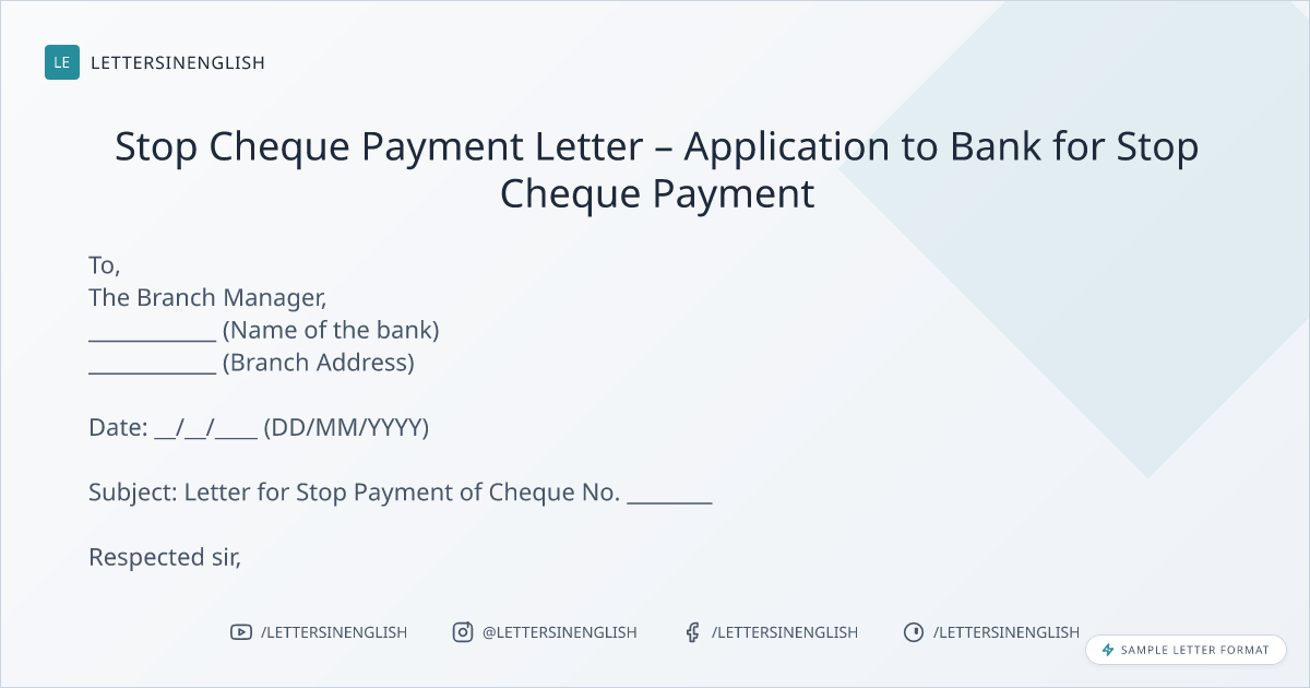 Stop Cheque Payment Letter – Application to Bank for Stop Cheque Payment