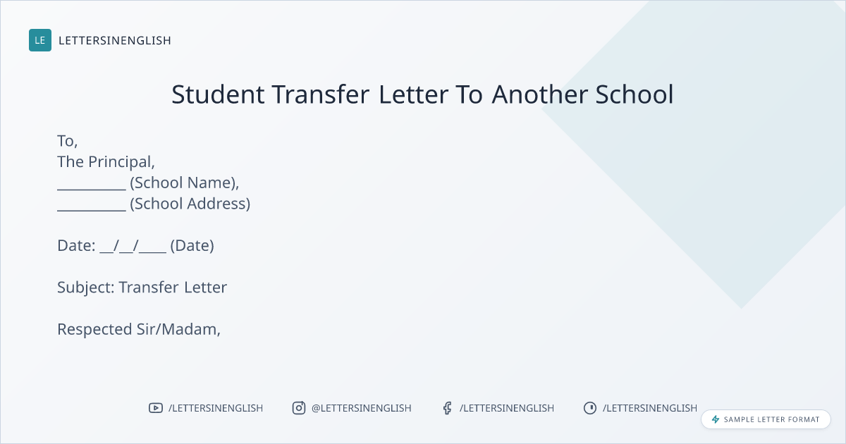 I am writing this letter, requesting you to kindly issue the transfer letter in my name, as I __________ (Reason- getting bullied/non-supportive classmates, any other reason). Due to this, I would not be able to continue in this school as it is getting difficult for me to focus on my studies.