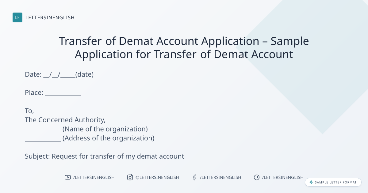 I am a holder of a demat account with DP ID ____________ (mention ID) and Client ID ____________(mention Client ID) with a registered mobile number _________ (mention mobile number). I would like to request you to transfer my demat account from ____________ to ____________ (name of the organization).