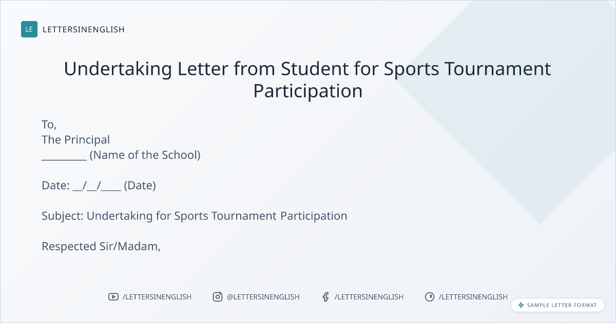 I hereby write to inform you that I will be participating in the upcoming sports tournament ____________ (Name, Date, and Place of the Tournament). I wholly undertake the responsibility of missing the _____________ (Number of classes) for _________ (Number of Days). I promise, as soon as I am back, I will resume my classes and cover up the missed part of the syllabus.