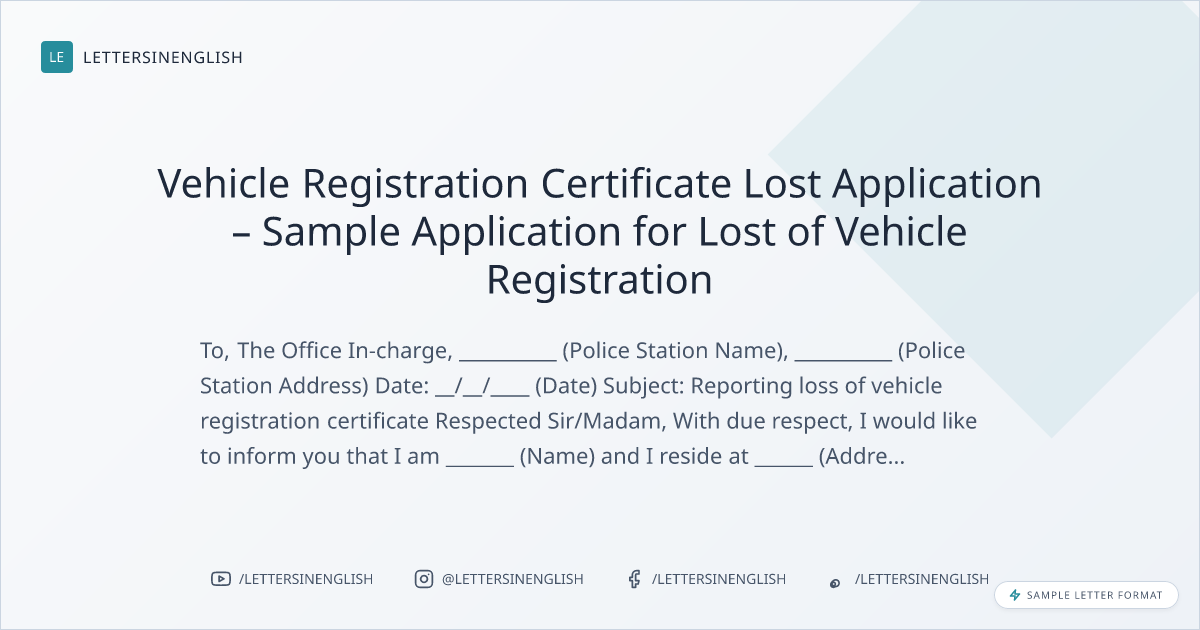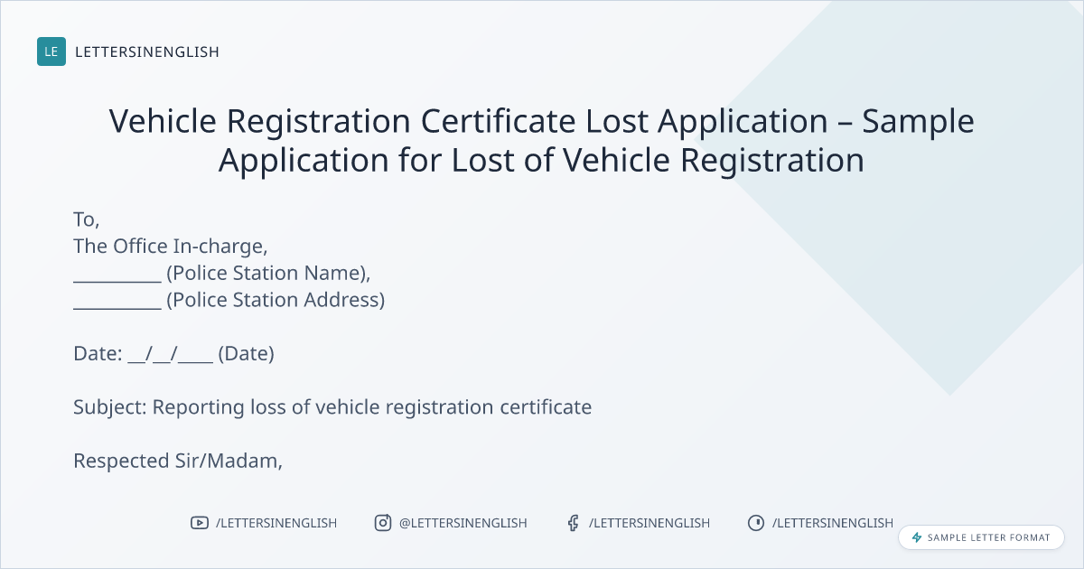 Vehicle Registration Certificate Lost Application – Sample Application for Lost of Vehicle Registration
