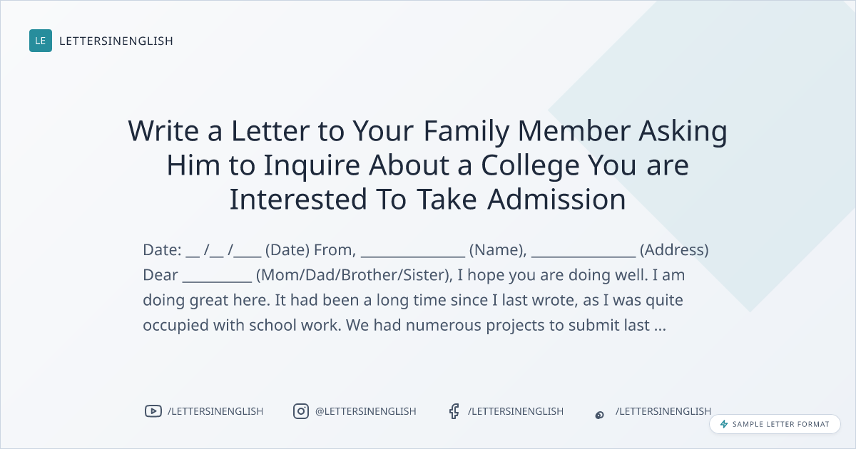 Write a Letter to Your Family Member Asking Him to Inquire About a College You are Interested To Take Admission