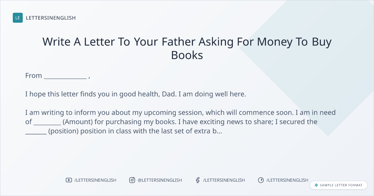 I am writing this letter to intimate you regarding my new session which is going to begin soon. I am in need of _________ (Amount) for my books. I have news to share, I secured the _______ (position) position in class with the last set of extra books that I purchased.