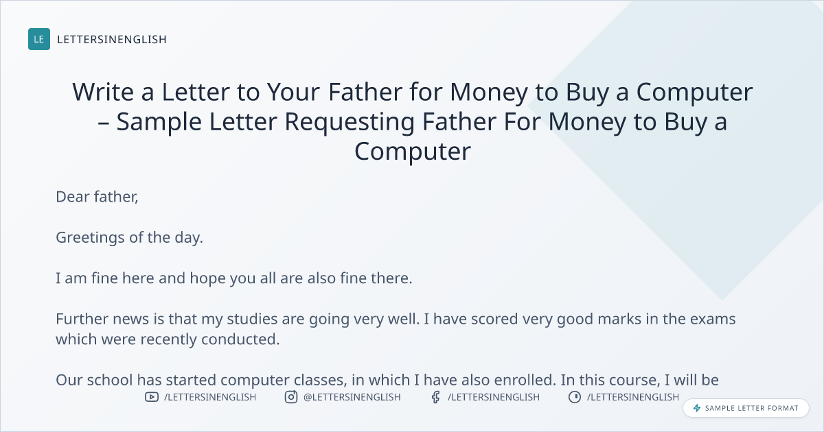 Write a Letter to Your Father for Money to Buy a Computer – Sample Letter Requesting Father For Money to Buy a Computer