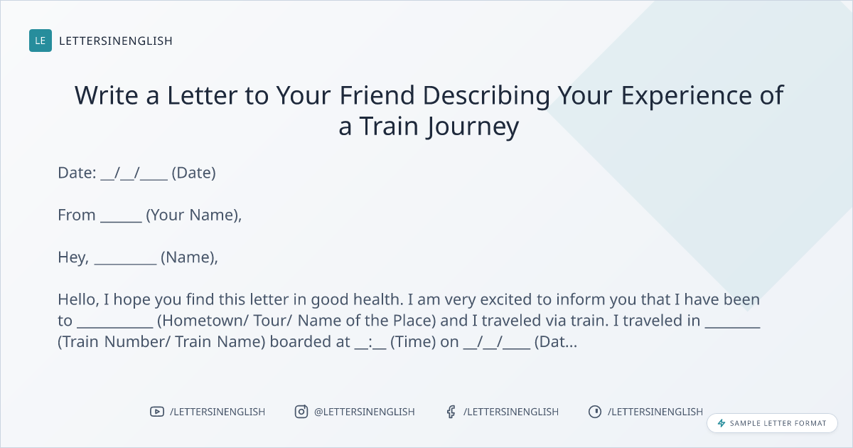 Hello, I hope you find this letter in good health. I am very excited to inform you that I have been to ___________ (Hometown/ Tour/ Name of the Place) and I traveled via train. I traveled in ________ (Train Number/ Train Name) boarded at __:__ (Time) on __/__/____ (Date) and reached the destination at __:__ (Time) of __/__/____ (Date).