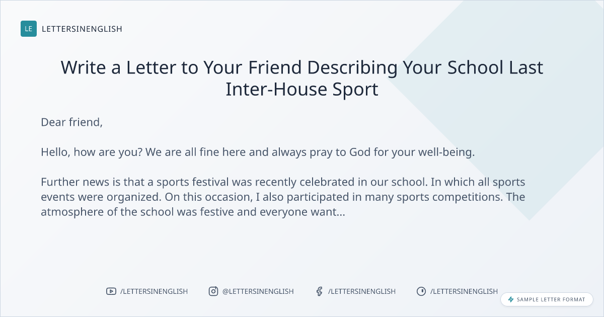 When writing a letter to describe your school's last inter-house sports event to a friend, maintain clarity and politeness. Highlight the excitement of the event, your participation, and the overall atmosphere, while avoiding unclear language and ensuring all necessary details are included.
