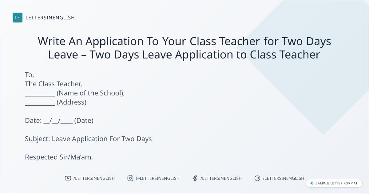 Sample Leave Application to Class Teacher for Two Days - Two-Day Leave Application to Class Teacher