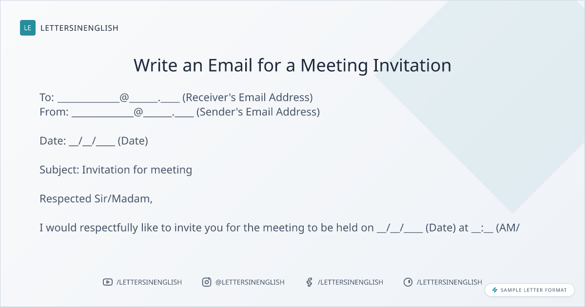 I would respectfully like to invite you for the meeting to be held on __/__/____ (Date) at __:__ (AM/PM). As discussed the purpose for this meeting is _________ (Purpose of the meeting). Meeting will be held at: __________ (Venue) with a duration of __________ (Minutes/ Hour).