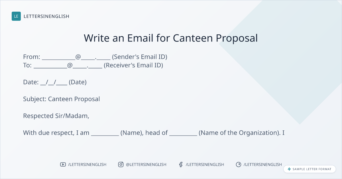 I have been working in this field and serving people since ___________ (Duration). I am also awarded with __________ (Hygienic service/ best service – Award name) in _______ (Year). I would humbly request you to kindly have a look at the brochure that I have attached with this e-mail for your kind reference. The canteen proposal is also attached to this e-mail.